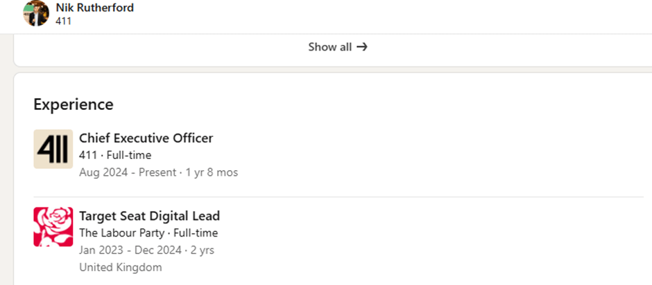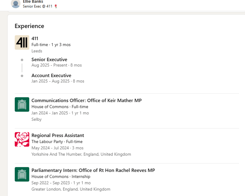 Ellie Banks, a senior exec at 411, was a Parliamentary Intern for Rachel Reeves from September 2022 to September 2023. She then worked as Communications Officer for Keir Mather MP from January 2024 to January 2025.