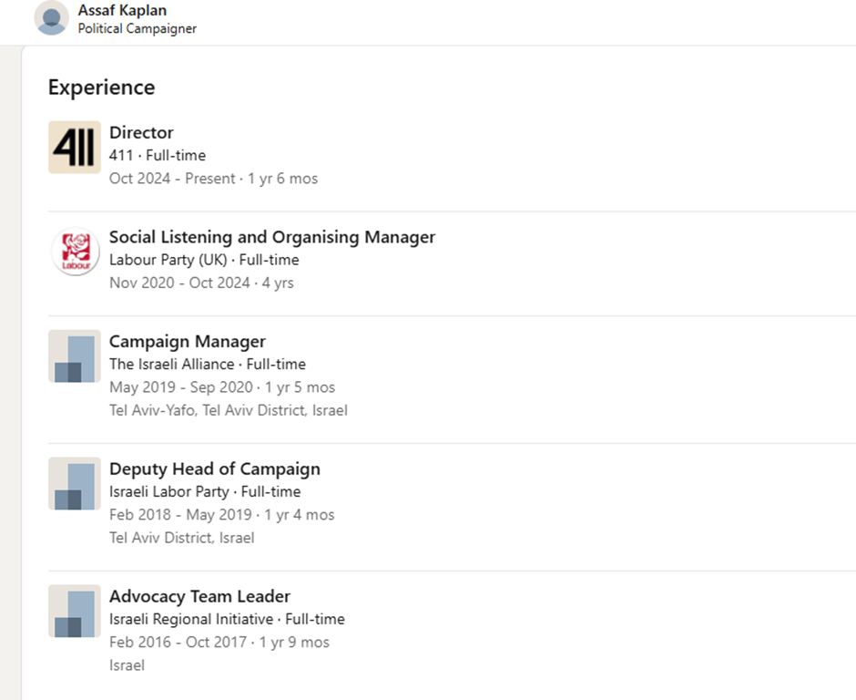 Assaf Kaplan — who was on the call when 411 tried to recruit me — was Labour’s Social Listening and Organising Manager from November 2020 to October 2024. He is also a former member of Israel’s Unit 8200, the military intelligence division.