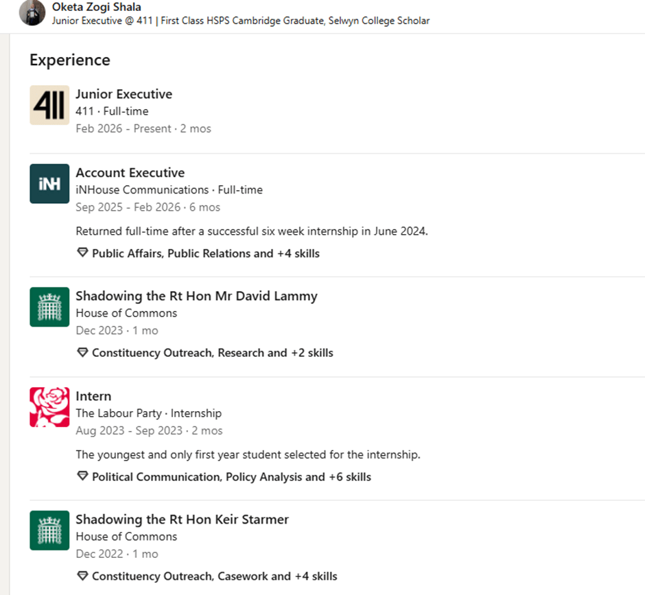 Oketa Zogi Shala, a junior exec at 411, shadowed both Keir Starmer and David Lammy.