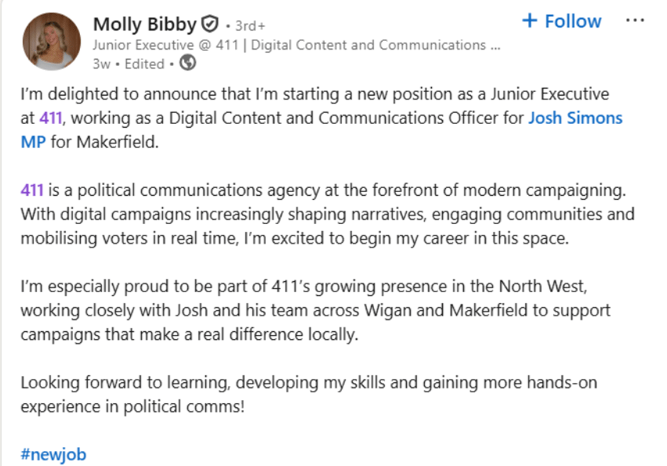 Molly Bibby, another junior exec, was Digital Content and Communications Manager for Josh Simons MP — who resigned just weeks ago after his think tank was accused of investigating journalists and referring information about them to GCHQ.