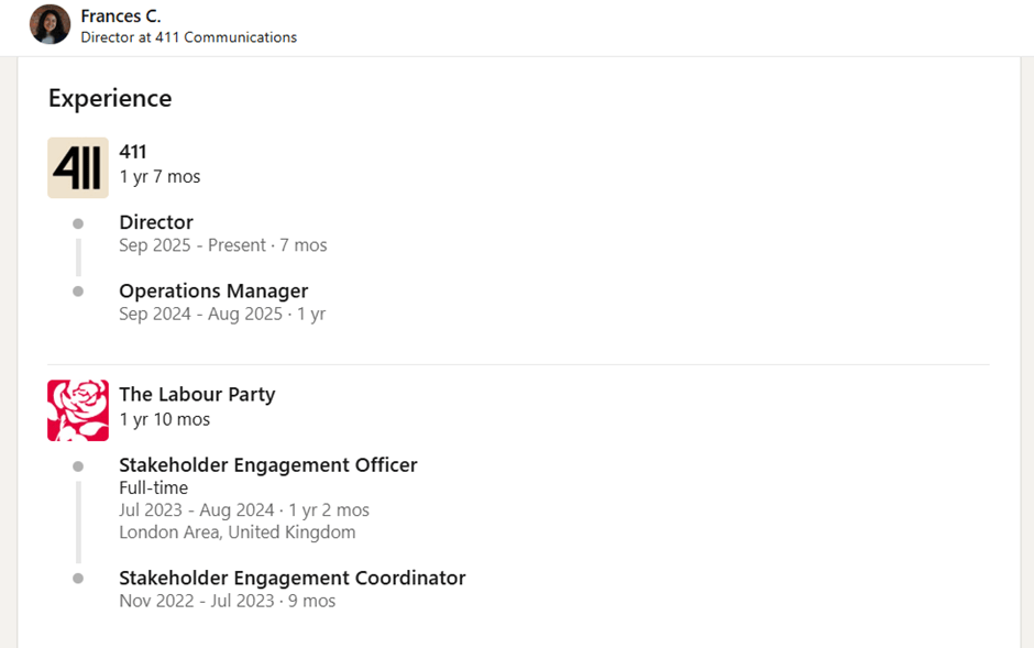 Frances C was a Stakeholder Engagement Officer for Labour from July 2023 to August 2024.
